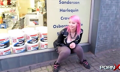 Kinky pink haired emo girlie in tight yoga pants pisses outdoors for fellow